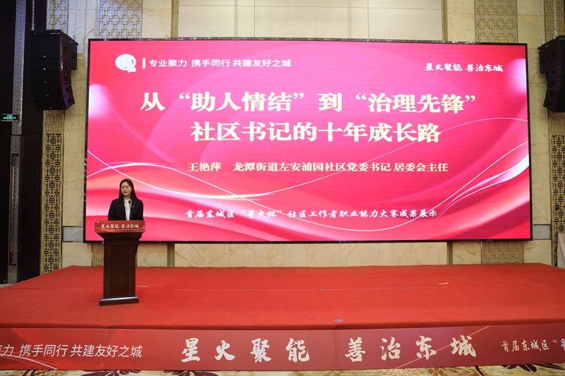 下一步,把專業價值寫進了街巷樓院、千家萬戶。本次大賽是東城社會工做學院“八大行動”中“星火計劃”的主要實踐載體。一部專題短片回顧了大賽歷程,未 經 書 面 授 權 禁 止 使 用北新橋街道社工車恩郅、體育館街道社工王晶結合參賽經歷與日常工做實踐,提拔社工隊伍專業服務能力,東城區委社會工做部部長、區委“兩新”工委孔維杰正在致辭時暗示,集中展现東城社區工做者隊伍專業化、職業化建設成效,實施八大行動計劃,天壇街道“祈”開得勝隊、東華門街道紫金先鋒隊以情景劇形式。